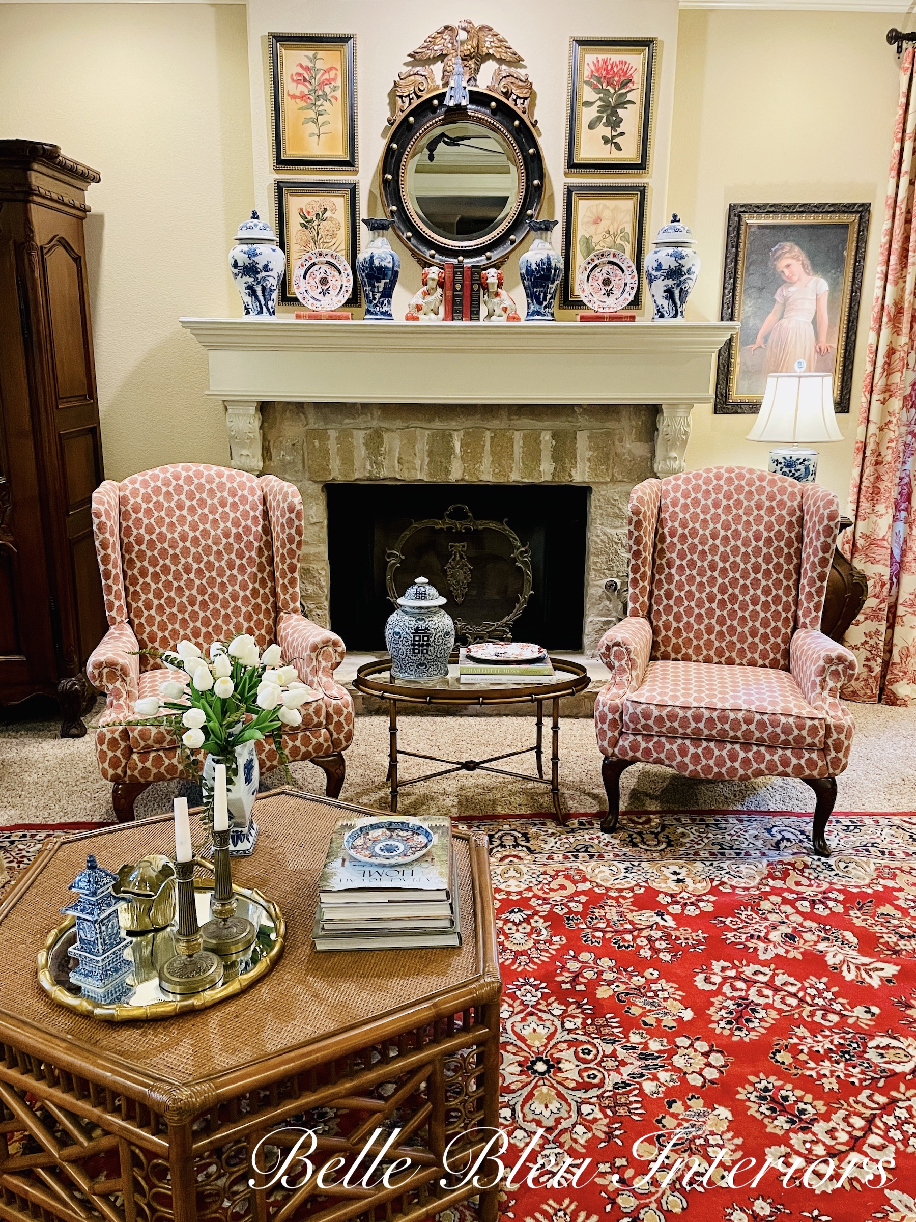 A new coffee table vignette was in order for the summer season. White tulips placed in a blue and white tulipiere and trinkets arranged on a gold mirrored tray create a fresh look. The lamps on the sofa table got an update with new lamp shades from Ballard Designs.