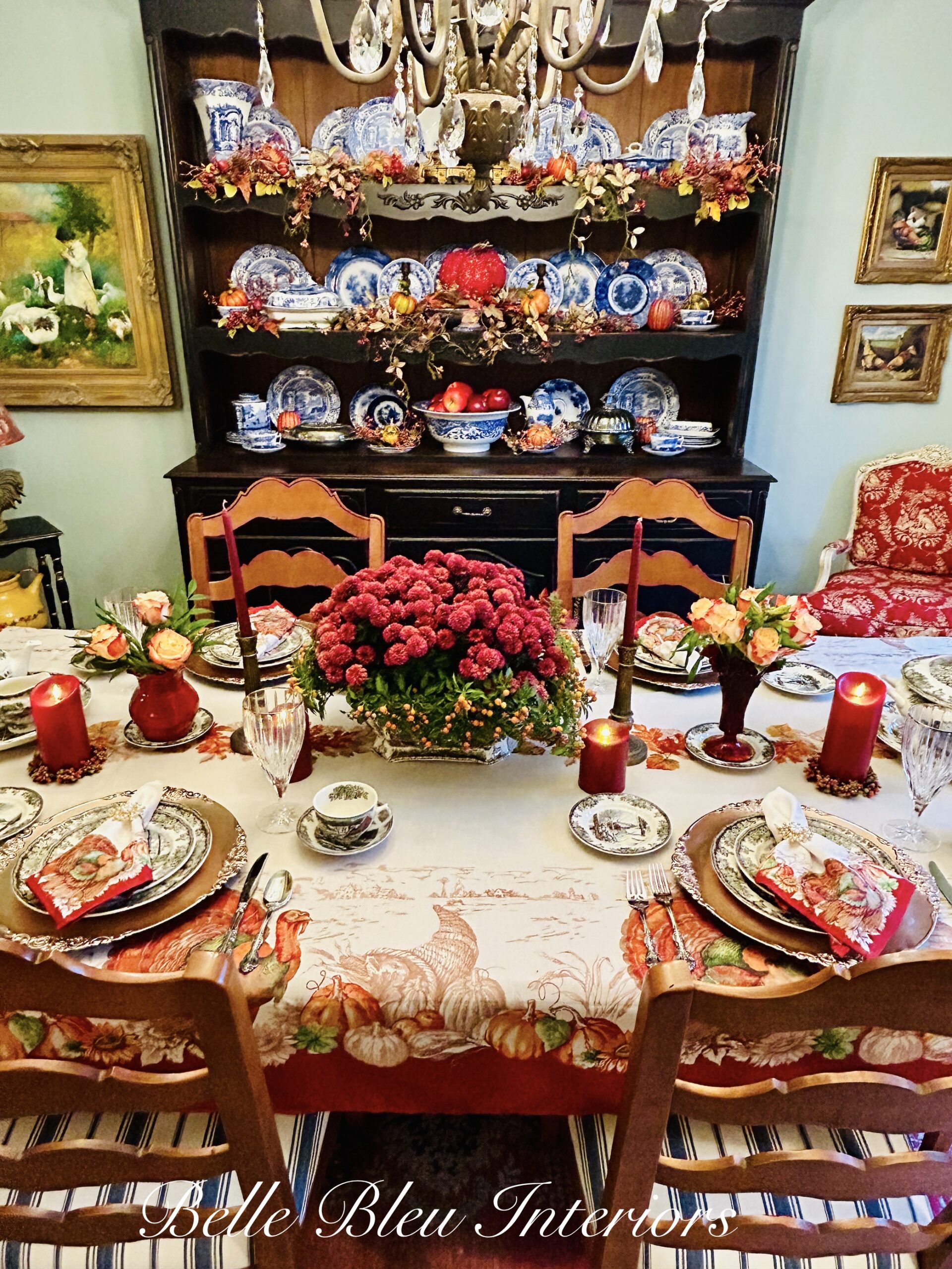 Good Morning Shannon, I love the pretty border on your tablecloth the turkeys, cornucopias and pumpkins! Your tureen makes a beautiful centerpiece filled with mums and berries. I've always admired Johnson Brothers Friendly Village with varied pastoral scenes…it makes for such a welcoming table. I enjoy seeing how you decorate you’re your hutch for the seasons…the pop of orange from your leaves and pumpkins is such a pretty contrast to your collection of blue and white dinnerware. As always, it’s a treat to have a virtual seat at the table. Happy November! 🦃🧡