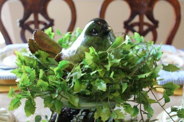 For the centerpiece, I placed a jadeite cake stand, added greenery, and perched a bird in the center. I also placed a decorative nest that I already had at the base of the cake stand.